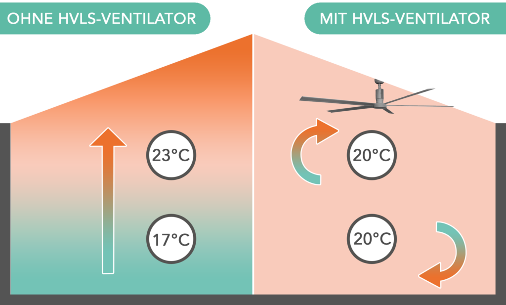 In großen Gebäuden mit hohen Decken sammelt sich die warme Luft oben. HVLS-Ventilatoren drücken diese Wärme zurück in die Aufenthaltszone und reduzieren den Heizenergieverbrauch während der Heizperiode typischerweise um ca. 25 %.
