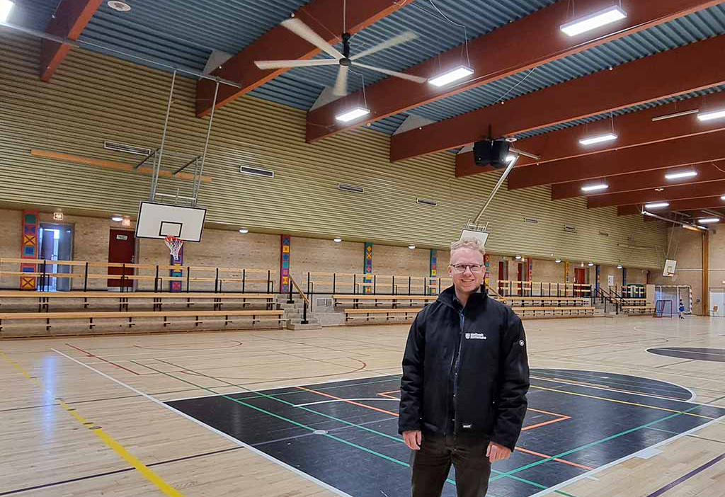 „Unsere Sporthalle wird mit Hackschnitzel aufgewärmt und jährlich geben wir ungefähr 70.000 DKK auf Wärme aus. Ich erwarte, dass wir mit den neuen Deckenventilatoren in der Lage sind, unser Wärmeverbrauch mit bis zum 15% zu senken.“